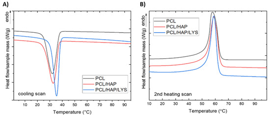 The composite samples were first heated to 100 °C and maintained at this temperature for 5 min under nitrogen to erase the previous thermal history. The cooling and second heating DSC curves are shown in Figure 5. The values of estimated thermal parameters are presented in Table 5. In all the DSC curves, two characteristic thermal effects are observed: crystallization at ~32.5–35.6 °C, and melting at temperatures over 53 °C. During the cooling from the melt, PCL underwent crystallization with an onset at 37.3 °C. For neat PCL foams and the PCL/HAP and PCL/HAP/Lys composites, the exotherm of melt crystallization is visible. The enthalpy of melt crystallization (ΔHc) occurring with a cooling rate of 10 °C/min had the highest value for neat PCL (55.8 J/g), while in composites the enthalpy was lower (−27.3 J/g for both samples). The temperature of melt crystallization was slightly higher for both composites than for the neat PCL foam. These results indicate an influence of the HAP content on the nucleating activity.