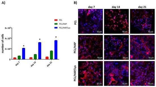 The dynamics of tissue regeneration is highly dependent on the first stages of the composite colonization by target cells, and their readiness to adhere and propagate within the biomaterial. In an ideal strategy, mesenchymal stem cells are attracted to colonize the scaffold and can then differentiate into mature osteoblasts, which drive and coordinate future bone regeneration. In this study, we used hFOB1.19 cells, model pre-osteoblasts with many features of mesenchymal stem cells, which are able to terminally differentiate into proper osteoblasts. Initially, we evaluated the morphology of hFOB 1.19 osteoblasts and their ability to adhere and colonize the PCL-based composites (Figure 7). To address the question of whether the colonization of the composites is accompanied by their proliferation or differentiation into osteogenic cells, the osteoblasts were incubated at 39 °C with PCL-based composites and their proliferation rate and morphology were evaluated over the course of 21 days (data collected on days 7, 14, and 21). We have shown that PCL/HAP/Lys scaffolds, in comparison to PCL/HAP and PCL scaffolds, promote efficient pre-osteoblast proliferation (Figure 7A). The mean number of cells (MNoC) identified within PCL/HAP/Lys scaffolds was significantly (p < 0.05) higher as compared to the proliferation rate induced by the reference (PCL) composite. The MNoC identified within PCL/HAP/Lys reached 2.2 × 105 ± 2.1 × 102 (on day 7), 3.3 × 105 ± 6.5 × 102 (on day 14), and 3.6 × 105 ± 3.0 × 102 (on day 21) and were significantly higher as compared to MNoC for the control (PCL) composite: 0.3 × 105 ± 3.2 × 102, p = 0.004 (on day 7), 0.3 × 105 ± 6.3 × 102, p = 0.004 (on day 14) and 0.4 × 105 ± 6.7 × 102, p = 0.004 (on day 21). In addition, osteoblasts cultured with PCL/HAP exhibited a higher proliferation rate, compared to the PCL scaffold. We have also shown that PCL/HAP/Lys-dependent proliferation was accompanied by successful colonization of the composite by osteoblasts (Figure 7B), which is evidenced by the higher cell densities observed after 7, 14, and 21 days of incubation with PCL/HAP and PCL/HAP/Lys composites.