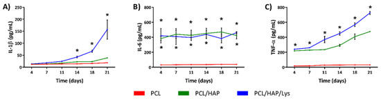 We have shown that the modification of foam scaffolds with HAP and Lys led to a significant increase in IL-1β, IL-6, and TNF-α production by hFOB 1.19 as compared to the concentration of these cytokines detected in cell cultures incubated with PCL (Figure 8A–C). The increase in IL-1β induced by PCL/HAP/Lys in comparison to PCL scaffolds was especially noticeable from day 14 (42.4 ± 3.7 pg/mL and 14.2 ± 0.8 pg/ mL, p = 0.005), through day 18 (66.6 ± 4.7 pg/ mL and 15.8 ± 0.2 pg/ mL, p = 0.004) and at the end of the experiment (157.1 ± 40.1 pg/ mL and 18.4 ± 0.5 pg/ mL, p = 0.004) (Figure 8A).