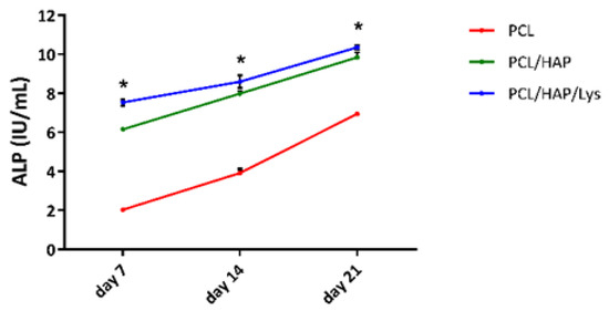 Alkaline phosphatase (ALP) activity serves as an early marker for the osteoblast differentiation involved in bone calcification and hard tissue formation. Osteoblastic differentiation was assessed by measuring ALP activity after 7, 14, and 21 days of hFOB 1.19 osteoblasts cocultured with the PCL-based foam scaffolds. We have observed the upregulation of ALP production in cell cultures induced by PLA/HAP/Lys and PLA/HAP scaffolds, whereas no such effect was observed for cells cultured with control (PCL) scaffolds. The PCL/HAP scaffold was modified with L-Lysine-stimulated hFOB 1.19 cells to produce significantly higher ALP concentrations than those detected in cell cultures exposed to PCL composites on days 7, 14, and 21 (7.5 ± 0.2 U/mL, p = 0.02, 8.6 ± 0.3 U/mL, p = 0.02, 10.4 ± 0.1 U/mL, p = 0.02, respectively) (Figure 9). Although PCL/HAP also induced an increase in ALP activity, these differences were not recognized as statistically significant: the level of ALP produced by osteoblasts cultured on the PCL and PCL/HAP scaffolds were as follows (2.0 ± 0.08 U/mL and 6.1 ± 0.02 U/mL on day 7; 3.9 ± 0.2 U/mL and 7.9 ± 0.2 U/mL on day 14; and 6.9 ± 0.1 U/mL and 9.8 ± 0.2 U/mL on day 21, respectively).