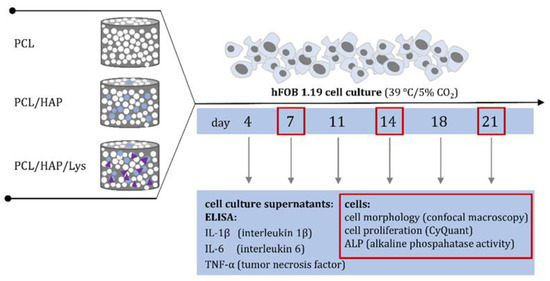 The timeline for biological studies of PCL, PCL/HAP, and PCL/HAP/Lys scaffolds based on cell analysis or soluble markers of osteoinduction evaluated at selected time points.