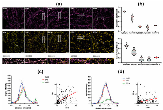 (a) Representative images of Np65, pNp, GM1, GD1a, GD1b, and GT1b immunofluorescence signals in cultured hippocampal neurons. Individual cultures were stained for Np65 (magenta, top row) and either pNp, GM1, GD1a, GD1b, and GT1b (yellow, middle row). The squares represent areas that were magnified, overlapped and shown as merged images in the bottom row (merged images of Np65 and pNp, GM1, GD1a, GD1b, and GT1b immunoreactivity, from left to right). Scale bar 5 microns. (b) Upper graph: Pearson’s coefficients showing highest colocalization of Np65 with pNp and GM1 and less with GT1b, GD1a, and GD1b. Lower graph: Mander’s coefficients showing highest colocalization of Np65 with pNp and GM1 and less with GT1b, GD1a, and GD1b. (c) Left: distribution of signal intensity of Np65, pNp, and GM1 over distance. Right: Correlation between Np65 and GM1 signal intensity. (d) Left: distribution of signal intensity of Np65, pNp, and GD1a over distance. Right: Correlation between Np65 and GD1a signal intensity.