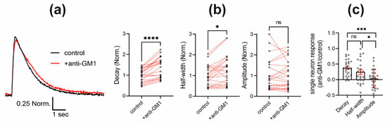 (a) Representative traces of electrically evoked somatic calcium transients before (control, black trace) and after 5 min treatment with anti-GM1 antibodies (+anti-GM1, red trace). (b) Decay time, half-width, and amplitude of the calcium transients were quantified, normalized, and plotted for each neuronal soma. Paired responses are connected by a segmented red line. For decay **** p < 0.0001 and half-width * p < 0.05 when paired control and +anti-GM1 are compared using Wilcoxon matched-pairs signed rank test (n = 24 neurons from 3 independent cultures). (c) +anti-GM1/ control ratio is shown for each single neuron and mean and SEM are displayed for each parameter. For decay time vs. amplitude *** p < 0.001 and half-width vs. amplitude * p < 0.05; ns = not significant.