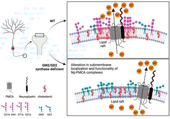 Recent reports demonstrated that approximately 95% of PMCA is associated with Neuroplastin (Np) [6,7,8]. The two Neuroplastin isoforms (Np65 and Np55) are heavily glycosylated transmembrane proteins and members of the immunoglobulin-superfamily of cell adhesion molecules. Neuroplastin has been involved in synaptic plasticity, is essential for cognition, long-term potentiation, and associative memory formation, in addition to being implicated in Alzheimer’s disease [9,10,11,12,13,14,15,16,17,18,19,20]; for a recent review see Ilic et al. 2021 and Lin et al. 2021 [19,20]. We reported that Neuroplastin expression is altered in the brains of mice lacking complex gangliosides [21], using a genetically engineered mouse model that lacks the GM2/GD2 synthase enzyme. The GM2/GD2 synthase, coded by the B4galnt1 gene, is responsible for synthesizing a- and b-series gangliosides, including GM1, GD1a, GD1b and GT1b which constitute 95% of all gangliosides in the mammalian brain [22,23]. The association of PMCA with rafts [24,25,26,27] and our research on the influence of gangliosides on expression and localization of Neuroplastin [21] suggests that PMCA-Np complexes may be affected by gangliosides.
