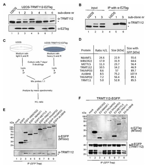 To identify the TRMT112-protein-interacting partners in mammalian cells, we performed a SILAC assay coupled with a co-immunoprecipitation assay similar to our previous study []. First, the stable TRMT112-E2Tag expressing U2OS cell line was generated. The epitope tag E2Tag was inserted into the C-terminus of the protein, as our previous studies have shown that the N-terminal epitope tag interrupted the interaction surface of TRMT112 and WBSCR22 []. An immunoblot analysis of six different subclones confirmed that TRMT112-E2Tag is expressed in most of the stable cell line clones obtained, though at different levels (Figure 1A). We noticed that the expression of recombinant TRMT112 had a decreasing effect on the endogenous TRMT112 protein levels (Figure 1A upper panel, the star refers to the endogenous protein). The recombinant TRMT112 protein was immunoprecipitated from the cell lysates of stable cell line clones using antibodies against E2Tag (Figure 1B), confirming that these cells could be used for further analysis.