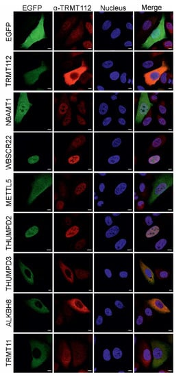 Next, we studied the subcellular localisation of TRMT112 and its partner MTases by overexpressing EGFP-fused MTases in U2OS cells (Figure 2) and then counterstaining the cells with the TRMT112 primary antibody to follow co-localisation. The endogenous TRMT112 protein itself is localised in both the cytoplasm and nucleus in U2OS cells and cells expressing EGFP (Figure 2 and Figure S1). TRMT112-EGFP localisation is similar to the localisation of free EGFP, where the signal is evenly distributed across the cell. EGFP-N6AMT1 and EGFP-METTL5 were detected all over the cell, whereas EGFP-WBSCR22 and EGFP-THUMPD2 displayed a strong nuclear signal. Furthermore, EGFP-WBSCR22 accumulated in the nucleolus, similar to our previous study []. EGFP-THUMPD3, EGFP-ALKBH8 and EGFP-TRMT11 all exhibited cytoplasmic localisation. The partner MTases co-localised with the endogenous TRMT112 protein, either in the cytoplasm or nucleus of the cell, and, in several cases, overexpressed MTase determined the localisation of endogenous TRMT112. Our results indicate that TRMT112 accumulates in the nucleus and is not significantly detected in the nucleolus in cells expressing EGFP-WBSCR22 and EGFP-THUMPD2, whereas, in the case of EGFP-ALKBH8 and EGFP-THUMPD3, TRMT112 accumulates in the cytoplasm (Figure 2). The subcellular localisation of endogenous MTases using commercially available antibodies is shown in Figure S1. In some cases, overexpressed proteins are localised differently from endogenous ones. It is worth noting that most of the antibodies used herein are polyclonal and may sometimes show a unspecific pattern.