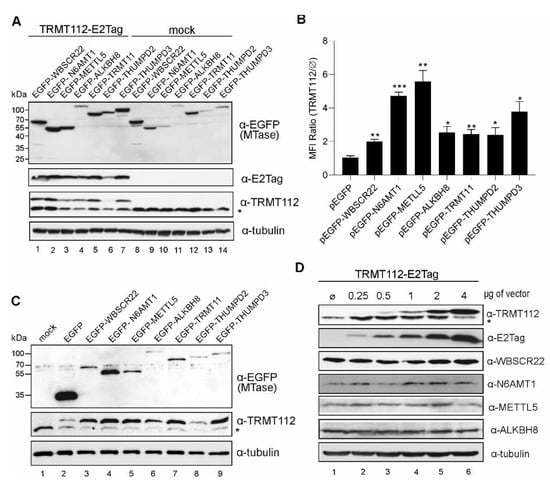 In our previous works, we noticed that the expression of recombinant WBSCR22 and N6AMT1 proteins, together with TRMT112, stabilised both proteins in cells [,]. To study whether this is the case for all partners, we transfected the cells with expression plasmids encoding for EGFP-MTases with (Figure 3A, lanes 1–7) and without (Figure 3A, lanes 8–16) the TRMT112-E2Tag construct, and analysed the cells by Western blot. Co-expression with TRMT112 enhanced the expression level of all EGFP-MTases (Figure 3A, upper panel). Cells were additionally analysed with flow cytometry, where the MFIs (mean fluorescent intensity) of EGFP-MTase proteins were measured, and the activation of MTase expression was calculated as the MFI ratio with and without TRMT112 (Figure 3B). TRMT112 did not affect the expression level of EGFP alone, and this was set as 1. The expression of TRMT112 noticeably increased the amount of all recombinant MTases in the cells, though to a different extent. The biggest effect, which was almost five times, was seen for N6AMT1 and METTL5, and a more modest increase of only 2–3 times was seen for WBSCR22, ALKBH8, TRMT11, THUMPD2 and THUMPD3.