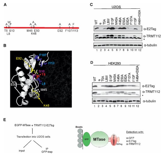 Recent structural analyses have revealed that, in all TRMT112-MTase complexes studied so far, TRMT112 interacts with MTases in a similar way. In the N6AMT1-TRMT112 complex, as well as the METTL5-TRMT112 complex, proteins interact with each other through a large surface (1200 Å and 1160 Å, respectively) characterised by the presence of a large hydrophobic core surrounded by hydrophilic interactions [,]. To investigate whether TRMT112 interacts similarly with all of its partners in cells, several amino acids locating on the interface of the TRMT112-MTase complex were mutated. Mutations were chosen based on crystallographic data, as well as an in silico analysis (see Materials and Methods). Amino acids Leu8, Met45 and Ile113 of TRMT112 forming hydrophobic interactions with both N6AMT1 and METTL5 [,] were replaced with L8W, M45A and I113F, respectively. Hydrogen-bond forming amino acids Thr5, Ser10 and Lys48 [] were substituted with T5A, S10F and K48A. In addition, we made mutations E50A, E92A and F107A and the double-mutation K48A + E92A. Replaced amino acids were chosen based on calculations on the effect of mutations using the FoldX program. The mutations and their localisation on the METTL5-TRMT112 complex are shown in Figure 4A,B.