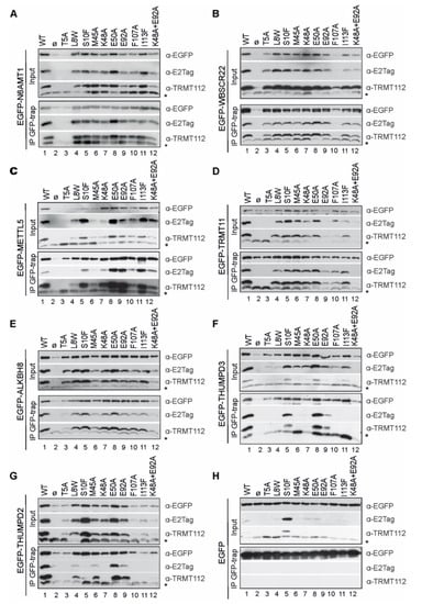 Next, we transfected the cells with two expression vectors, encoding for EGFP-MTase and E2Tag-TRMT112 or its mutant, and performed an immunoprecipitation assay with GFP-Trap beads using EGFP-MTase as a bait, as depicted in Figure 4E. In Figure 5, input sections depict the soluble fraction of samples, whereas IP GFP-trap panels show immunoprecipitated proteins. EGFP-MTase proteins were able to interact with both recombinant and endogenous TRMT112 proteins and immunoprecipitated them from cells. Again, a strong stabilisation effect obtained with co-expression of MTases and TRMT112 in cells was observed (Figure 5; lanes 1, 2). Results reveal that TRMT112 mutant-MTase interactions have numerous similarities, along with several differences. Based on the crystallographic data, amino acids Leu8, Met45 and Ile113 of TRMT112 are directly involved in hydrophobic interactions with both N6AMT1 and METTL5 [,]. In our experiment, mutations L8W and M45A did not affect the TRMT112 interaction with N6AMT1, WBSCR22 and TRMT11 (Figure 5A,B,D; lanes 4, 6), but, in both cases, disturbed the TRMT112 interaction with METTL5 and THUMPD3 (Figure 5B,F; lanes 4, 6), whereas the interaction with ALKBH8 was impacted only by M45A (Figure 5E; lanes 4, 6). I113F had no effect on either of them (Figure 5A–E; lanes 11). All three mutations L8W, M45A and I113F disturbed the THUMPD3-TRMT112 and THUMPD2-TRMT112 interactions (Figure 5F,G; lanes 11). The replacement of the phenylalanine in position 107 with alanine (F107A) influenced the TRMT112 interaction with WBSCR22, THUMPD2 and THUMPD3, had a less noticeable effect on TRMT11, and did not influence interactions with N6AMT1, ALKBH8 and METTL5 (Figure 5; lane 10).