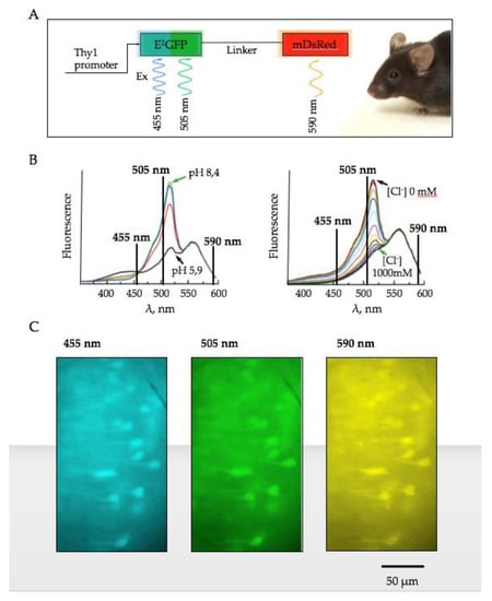 - Arosio, D.; Ricci, F.; Marchetti, L.; Gualdani, R.; Albertazzi, L.; Beltram, F. Simultaneous intracellular chloride and pH measurements using a GFP-based sensor. Nat. Methods 2010, 7, 516–518. [Google Scholar] [CrossRef]
