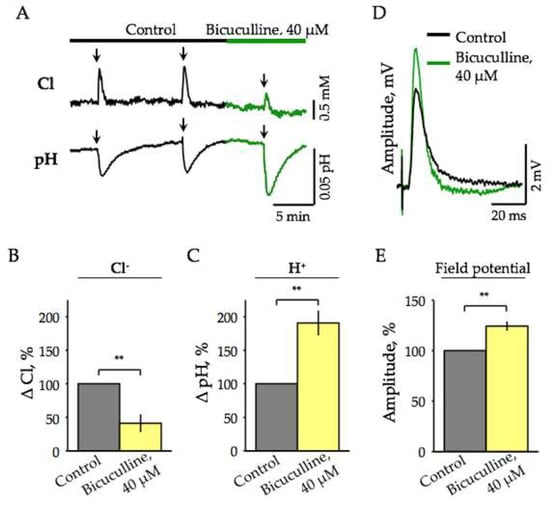 In order to test the assumption that during synaptic stimulation, the accumulation of Cl− in the hippocampal neurons is, at least partially, due to Cl− influx via activated GABAA receptors, we applied bicuculline, an antagonist of these receptors [34]. The traces shown in Figure 2A illustrate that upon the synaptic stimulation, bicuculline strongly decreased the amplitude of synaptically induced changes of [Cl−]i. On average, the mean amplitude of Cl− influx decreased to 41.2 ± 12.2% (Figure 2B, n = 7, p < 0.01). In contrast, upon application of bicuculline the amplitude of synaptically induced pH transients increased by 90.7 ± 17.4% (Figure 2C, n = 8, p < 0.01). Picrotoxin, a blocker of Cl−-selective GABA receptor channels, caused similar changes in the amplitudes of Cl− and pH transients (data not shown).