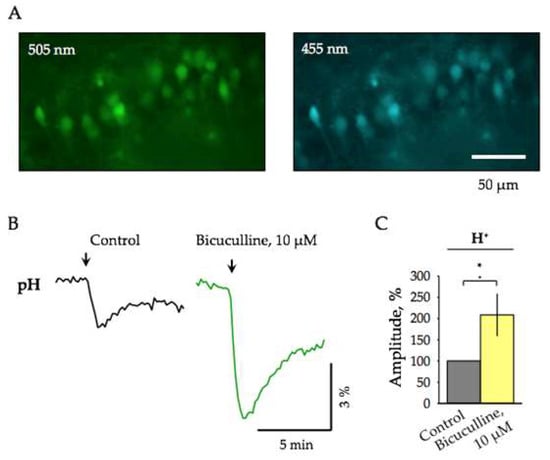 Neuronal activity is accompanied by dynamical changes in the intra- and extracellular concentration of ions. A number of studies demonstrated that activation or inhibition of neurons can cause a rapid shift of hydrogen (H+) and chloride (Cl−) [1,2,3]. The physiological intracellular pH range in different eukaryotic cells is 6.5–8.0 [4], which corresponds to a very low free H+ concentration, from 10 nM to 300 nM. In the mammalian brain the intracellular pH is 7.0–7.4 [5,6] reflecting the importance of maintaining the intracellular H+ concentration ([H+]i) in a narrow range.