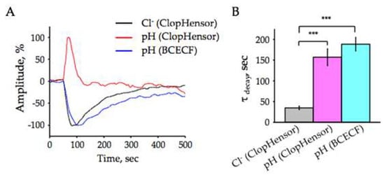 To measure pH and Cl− in cells of biological organisms, several methods have been proposed. The most used are ion-selective microelectrodes [17,18,19], fluorescent dyes [20,21,22] and genetically encoded probes [7,23,24,25,26]. Especially promising are genetically encoded fluorescent sensors, which allow non-invasive monitoring of intracellular ion concentrations in specific cell types.