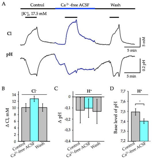 2.6. [K+]o-Induced Changes of pH and Cl− in a Ca2+-Free ACSF