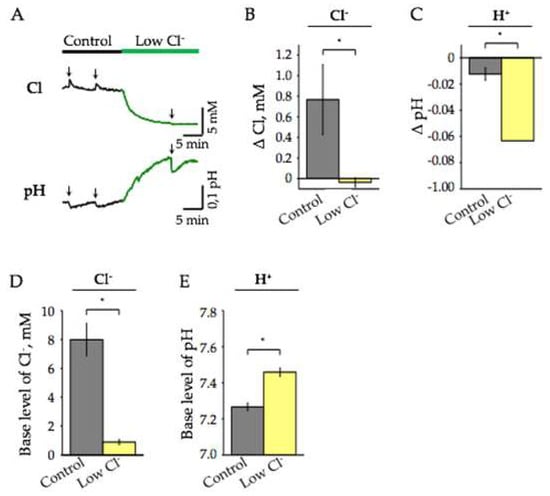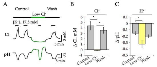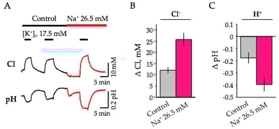 Changing the solution to a low-Na+ ASCF (replacement of NaCl with choline Cl) led to a decrease in the base level of intracellular Cl− and H+ (Figure 8A). The mean changes were for [Cl−]i by 1.98 ± 0.15 mM (n = 5, p < 0.05, 6 months) and for H+ by 0.08 ± 0.01 pH units (n = 5, p < 0.05, 6 months). In low-Na+ ASCF, responses to K+-induced depolarization were potentiated by more than 2 times for both ions, resulting in the mean changes of 25.77 ± 2.74 mM and 0.40 ± 0.05 pH units (n = 5, Figure 8B,C).