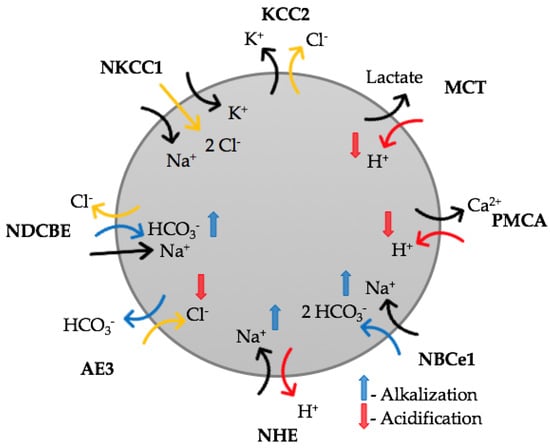 To maintain H+ and Cl− in physiological ranges, various transporters, cotransporters, and other ion regulating proteins are expressed in cells of biological organisms. The regulation of intracellular [H+]i is primarily driven by Na+/H+ exchange, Na+-driven Cl−/HCO3− exchange, Na+/HCO3− cotransport, and Cl−/HCO3− exchange [1,14,15,16].