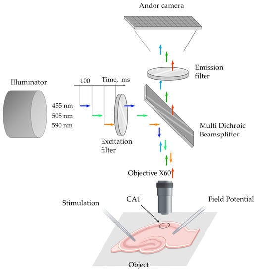Fluorescent signals were recorded from the CA1 zone of the hippocampus with the following lighting parameters in the Drive LED program: Exposition 70 ms, LED on 100 ms, binning 2, Voltage (590 nm) 70 mV, Voltage (505 nm) 10 mV, Voltage (455 nm) 15 mV. The slices were incubated in each solution until the fluorescence stabilized, usually for 20–30 min.