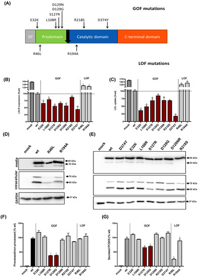 To establish a comprehensive evaluation of PCSK9 variants, we used a series of nine known GOF and LOF variants (Figure 1A). HEK293 cells were stably transfected with the following PCSK9 variants (GOF: E32K, L108R, S127R, D129G, D129N, R218S, and D374Y; LOF: R46L, R194A). Of note, the R194A variant has been generated to characterize the binding motifs of PCSK9 to the LDLR [23] and never described as naturally occurring.