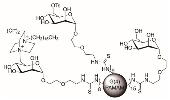 Carbohydrate functionalized PAMAM dendrimers were previously shown to act as antimicrobial agents [34,35]. Further functionalization of glycodendrimers with antibiotic moieties were shown to increase the effectiveness of the antibiotics relative to their monomeric counterparts by increasing activity and/or making it more difficult for the bacteria to develop resistance. In addition, the carbohydrates can increase the system’s solubility [1,30,36,37].
