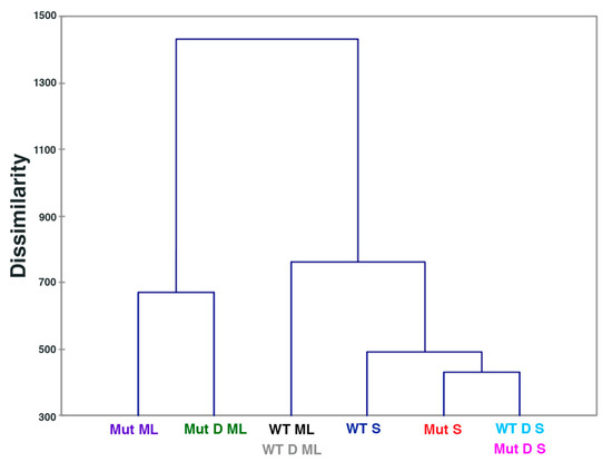 Hierarachical Clustering showing that WT ML and WT D ML cluster together, WT D S and Mut D S cluster together, and all other sample types are separate. Full names of sample groups are given in Table 1.