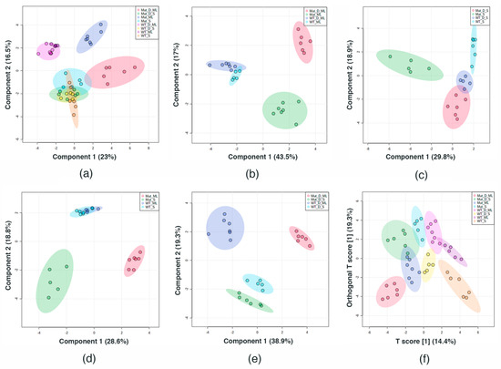 When only the mid log phase samples were plotted, the wild type samples (WT ML and WT D ML) had a small overlap while the mutant samples had a large separation (Figure 3b). This is due to the challenged and control wild type samples being more similar to each other, while the mutant samples were more different in the presence of DABCOMD than when they were unchallenged. As expected, WT D S clusters between WT S and Mut D S, whereas Mut S clusters farther away (Figure 3c). Figure 3d indicates that the wild type samples (WT ML and WT S) are similar to each other, whereas the mutant sample types (Mut ML and Mut S) are significantly different from each other, causing the wild type samples to cluster. Figure 3e shows that WT D S and Mut D S cluster closer together than the mid log phase samples, but sample overlaps were not observed. Ortho PLS–DA uses component one as a predictor of class, and component two is the variation perpendicular to the first component. The observable separation is improved when all of the sample types are plotted together using ortho PLS–DA relative to 2D sPLS–DA (Figure 3f). In addition, complete separation of the smaller sample groups shown in Figure 3b–e was observable when ortho PLS–DA was used (graphs are available in the Supplementary Materials).