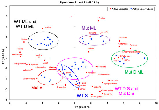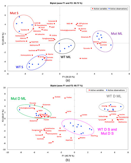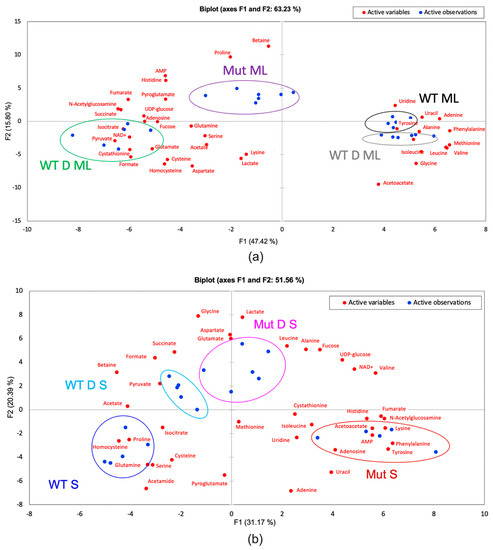 PCA biplots showing the distribution samples (blue dots) with color coordinated sample labels and circles and the distribution of metabolites (red dots). (a) Mut ML, Mut S, WT ML, and WT S samples showing complete separation. (b) DABCOMD-challenged samples showing complete separation of WT D ML and Mut D ML, and the overlap of WT D S and Mut D S.