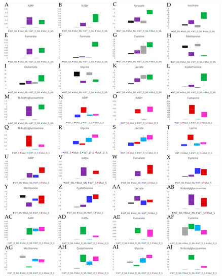 The comparison of the DABCOMD-challenged wild type (never been exposed to DABCOMD before) to the unchallenged mutant samples (mutated in the presence of DABCOMD) is shown in Table 10 and Table 11. These samples always cluster separately in the mid log phase (Figure 2a, Figure 3a,b, Figure 5, Figures S4a,d, S5a,b, S6 and S7a,b) and almost cluster separately in the stationary phase (Figure 2a, Figure 3c, Figure 5b, Figures S4a,e, S5a,c and S7a,c). The only instances where these sample groups cluster together is in the stationary phase was when all eight sample types are plotted together (Figure 3a, Figure 4 and Figure S6). The differences between the stationary phases are smaller than those in the mid log phase, thus causing the stationary phases to cluster closer together when they are all plotted on the same graph. The unchallenged mutant samples and the challenged wild type samples clustering into unique sample types with many metabolite concentration differences (24 and 23) and large fold change differences (61.5, 12.4 and 9.1-fold in the mid log and 48.7, 11.1 and 8.9-fold in the stationary in the mutant samples), strongly suggests that the mutant samples truly are mutated variants of the original bacterial strain. Challenged wild type samples and unchallenged mutant samples, or the challenged wild type samples and challenged mutant samples, would likely cluster together if the DABCOMD only temporarily activated different pathways. Unchallenged mutant mid log samples had higher concentrations of NAD+, AMP, fumarate, succinate, and pyruvate than the mid log challenged wild type samples. The unchallenged mutant samples in the mid log phase also had higher concentrations in N-acetylglucosamine and cystathionine when compared to challenged wild type samples in the mid log phase. Nucleotide metabolism components in the mid log phase had decreased concentrations of adenosine and higher concentrations of adenine and uracil in the challenged wild type samples, in comparison with the unchallenged mutant samples. In the stationary phase, the unchallenged mutant samples had higher concentrations of these metabolites relative to the metabolite concentrations found in the challenged wild type samples. These changes were also observed in the stationary phase, with the unchallenged mutant samples having a fold increase of 11.1 in NAD+, 8.9 in fumarate, 2.3 in AMP and 48.7 in N-acetylglucosamine relative to the challenged wild type samples. Lysine, N-acetylglucosamine and cystathionine were in excess in Mut S. Betaine had a 3.6-fold change decrease in WT D ML in comparison to Mut ML and negatively correlated to glycine, aspartate, cystathionine, cysteine, homocysteine, and pyruvate, while betaine had a 3.2-fold increase in WT D S when compared to Mut S and negatively correlated to cystathionine and N-acetylglucosamine. A positive correlation to homocysteine, glycine and pyruvate was also observed for betaine in WT D S compared to Mut S. In both the mid log and the stationary phases, both WT D and Mut had significant changes in the metabolites for energy pathways, aminoacyl-tRNA biosynthesis, peptidoglycan synthesis and associated pathways.