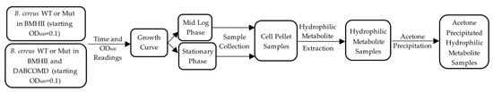 FDA strain PC1 213 B. cereus (ATCC 11778) was used for all the wild type (WT) samples and was mutated in the presence of DABCOMD as previously described in VanKoten et al. 2016 to create the mutant (Mut) samples. Unchallenged samples of both WT and Mut bacteria were grown in Brodo Mueller Hinton II Media (BMHII), the challenged samples (WT D and Mut D) were grown in BMHII with 0.37 μM/L of DABCOMD added to the media (this is 33% of the MIC value [27]). All other procedures were the same between the two groups. There were eight different sample types: unchallenged wild type mid log phase samples (WT ML), challenged wild type mid log phase samples (WT D ML), unchallenged wild type stationary phase (WT S), challenged wild type stationary phase (WT D S), unchallenged mutant mid log phase (Mut ML), challenged mutant mid log phase (Mut D ML), unchallenged mutant stationary phase (Mut S), and challenged mutant stationary phase (Mut D S). A detailed description of how the samples were grown, collected, and standardized is provided in the Supplementary Materials. A visual overview for the procedures is shown in Figure 8.