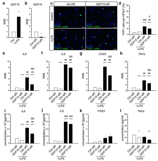 P. gingivalis-LPS induce a strong pro-inflammatory response of HPdLF [,,]. We could detect an increased expression of GDF15 in six hours LPS-stimulated HPdLF (Figure 1a). To elucidate the role of GDF15 in the response of HPdLF to the pathogenic stimulus, we performed siRNA-induced GDF15 knockdown (Figure 1b). GDF15 deficiency did not alter the activation of monocytes as shown by the THP1 adhesion assay (Figure 1c,d). However, the increase in adherent THP1 cells due to LPS treatment was significantly lower in GDF15-deficient cells compared with control siRNA-treated HPdLF, indicating an important role of GDF15 in inflammatory response to pathogenic stimuli.
