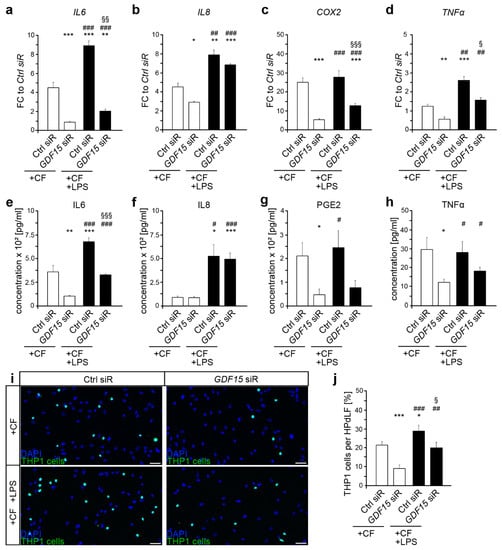 The pro-inflammatory response of HPdLF to mechanical and bacterial stimuli is partially modulated by GDF15. (a–d) Quantitative expression analysis of the inflammatory genes IL6 (a), IL8 (b), COX2 (c) and TNFα (d) in HPdLF treated with GDF15 siRNA (GDF15 siR) or Control siRNA (Ctrl siR), stimulated for six h with compressive force (+CF, white bars) and lipopolysaccharides of P. gingivalis (+LPS, black bars). The expression levels are displayed as fold change (FC) to Ctrl siR-treated cells. (e–h) Analysis of secreted cytokines IL6 (e), IL8 (f), PGE2 (g), and TNFα (h) in HPdLF under previous conditions. (i,j) Analysis of adherent THP1 monocytic cells (green, Alexa488-gelabled) on mechanically stressed GDF15-deficient HPdLF (blue, DAPI) in relation to the control under previous conditions (i). The relative number of THP1 cells is displayed per 100 HPdLF in (j). * p < 0.05; ** p < 0.01; *** p < 0.001 in relation to Ctrl siR +CF; # p < 0.05; ## p < 0.01; ### p < 0.001 in relation to GDF15 siR +CF, § p < 0.05; §§ p < 0.01; §§§ p < 0.001 in relation to Ctrl siR +CF +LPS. One-Way ANOVA and post hoc test (Tukey). Scale bars: 50 μm in (c).