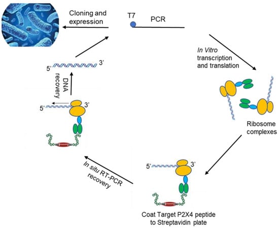 In recent years, in vitro display techniques, including phage and ribosome display, have become platform technology for the design, selection and production of reagents for targeted therapies, including for P2X3R [38]. Phage display has limitations including the inability to select antibodies under conditions different from the cell environment, problems with the selection of proteins that are toxic, cells circumventing selection pressure, and low transformation efficiency. All these deficits may be circumvented using in vitro ribosome display. Thus, the more favored cell-free ribosome display platform technology was utilized for the design, selection and production of reagents for a variety of targeted therapies [29,30,39,40,41,42].