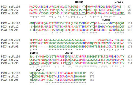 Amino acid sequences of VH-Linker-VL of P2X4R peptide. Amino acid sequences of VH-Linker-VL of P2X4R peptide-specific three mouse scFvs using Clustal Omega. Structural framework regions (FRs) and Complementarity-determining regions (CDRs) are determined by the IMGT information system. Diversity was found predominantly in the CDR regions. A normal 20 amino acid linker [(G4S)4] joins the VH and VL chains. Alignments were color coded according to residue property groups. AVFPMILW—red, DE—blue, RK—magenta, STYHCNGQ—green, and others—grey. * indicates sequence homology.