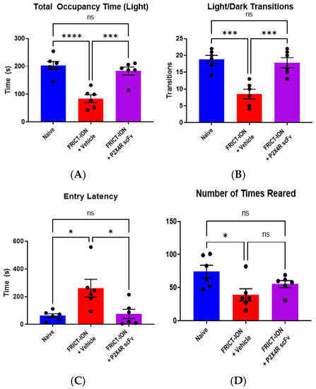 - Efficacy for a reduction in anxiety-like behavior. Based on its efficacy to reduce reflexive mechanical hypersensitivity in animals with persistent pain induced by the FRICT-ION model, the P2X4R scFv95 was selected as a lead candidate for additional testing of emotion-like behavioral assays. Vehicle-treated animals with FRICT-ION model-induced chronic pain displayed anxiety-like behavior. With the light/dark test, the number of transitions into and occupancy of the light chamber were significantly reduced (Figure 5A,B) compared to naïve controls. The time delay until vehicle-treated FRICT-ION mice entered the light chamber was significantly increased (Figure 5C) and exploratory rearing events decreased (Figure 5D) compared to naïve controls. Treatment of male FRICT-ION mice with P2X4R scFv95 significantly reversed these measures so that they were not different from naïve control animals (n = 6, one-way ANOVA, Dunnett’s multiple comparisons test; ** p < 0.01 and *** p < 0.001) (Figure 5). P2X4R scFv 95 was efficacious in reversing all the measures which were not significantly different from naive controls.