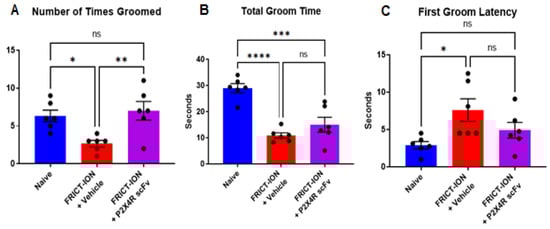 Figure 6. P2X4R scFv prevents development of depression. FRICT-ION model alters all grooming measures revealed with the Sucrose Splash test. (A). Number of grooming events is significantly increased by scFv95 compared to vehicle-treated FRICT-ION mice. (B). Treatment with P2X4R scFv95 does not alter time spent grooming in FRICT-ION mice, (C). but latency until the first grooming event is not significantly different compared to naïve controls. n = 6, ns = not significant, one-way ANOVA (Dunnett’s multiple comparisons test). * p < 0.05, ** p < 0.01, *** p < 0.001, and **** p < 0.0001.