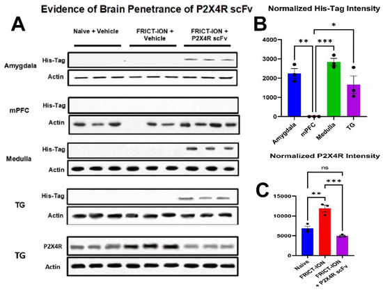Evidence for peripheral sensory neuron ganglia and brain penetrance of the P2X4R scFv 95 was sought with Western blot of tissues dissected week 7 after His-tagged P2X4R scFv95 administration. The His-tag was detected in amygdala, medullary brainstem, and TG of mice with FRICT-ION (Figure 7A). No His-tag was detected in the medial pre-frontal cortex (mPFC). The bar plot provides comparison of the content (Figure 7B).