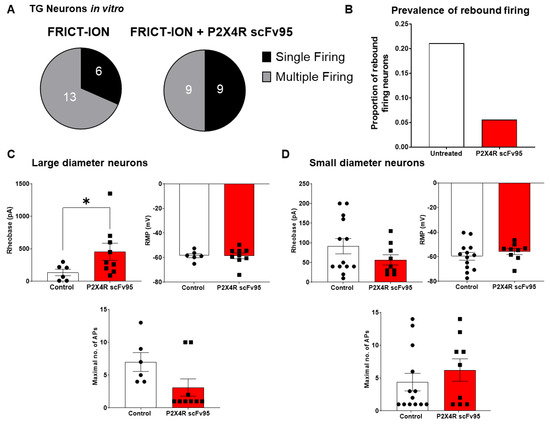 Effect of in vitro P2X4R scFv95 treatment on electrophysiological properties of TG neuron primary cultures from FRICT-ION mice. (A). Distribution of single vs. multiple action potential (AP) firing from untreated FRICT-ION and P2X4 scFv95 pre-treated FRICT-ION TG neurons. Prevalence of multiple firing was higher in untreated TG neurons from FRICT-ION mice than those with P2X4R scFv95 pre-treatment. (B). Prevalence of rebound firing in untreated FRICT-ION and P2X4R scFv95 pre-treated FRICT-ION TG neuronal cultures. Neurons with more rebound firing were observed more often in untreated cultures than in P2X4R-scFv-treated TG neurons from FRICT-ION mice. Effect of P2X4R-scFv treatment on electrophysiological properties of (C). large-diameter TG neurons (>25 microns) and (D). small- to medium-diameter TG-neurons (<25 microns). Untreated control n = 19 neurons, 8 mice. P2X4R scFv-treated n = 18 neurons, 5 mice. P2X4R scFv95 was used at a concentration of 4.5 μg/ml and treatment was performed for 1–2 h in the culture media. RMP = resting membrane potential. AP = action potential.