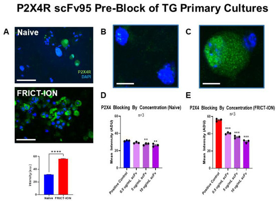 Immunofluorescent staining for P2X4R was minimally evident on TG neurons in primary cultures isolated from naïve BALBc male mice (Figure 9A top,B). Quantified staining intensity was significantly greater in TG primary cultures isolated from FRICT-ION mice compared to those from naïve mice as illustrated in the images and the bar graph (Figure 9A bottom,C). In TG primary cultures pre-blocked with increasing concentrations of P2X4R scFv95 antibody (0.5, 5, 10 µg/mL, 24 h), immunocytochemical staining intensity of P2X4R was incrementally less as concentration of P2X4R scFv95 increased in TG from both naive (Figure 9D) and FRICT-ION mice (Figure 9E).