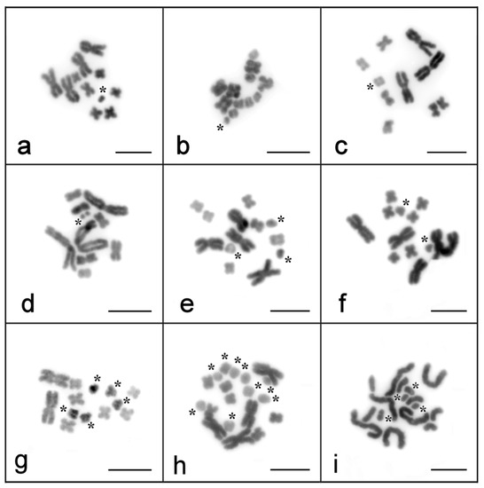 Metaphase spreads of M. lignano (a), M. janickei (b), M. mirumnovem (c–i). The metaphase spreads were obtained in 2017 (c,d), 2018 (e,f), and 2020 (a,b,g–i). B chromosomes are marked with an asterisk. Scale bar 10 µm.