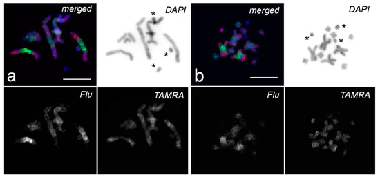 Painting patterns of metaphase chromosomes of M. mirumnovem after CISS-hybridization with PCP Mmi2med (Flu, green) and PCP Mmi2dist (TAMRA, red). DNA staining with DAPI (blue). (a) Bs are not painted with the DNA probes; (b) one B carries specific fluorescent signal from PCP Mmi2dist. Bs are marked with an asterisk. Scale bar 10 µm.