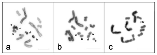 Heterogeneous morphology and sizes of B chromosomes among the specimens of M. mirumnovem. B chromosomes are marked with an asterisk. Scale bar 10 µm. (a) four of five Bs have intensively painted AT-rich regions in the q-arm; (b) the detected five Bs have different sizes; (c) one tiny B chromosome is much smaller than the smallest A chromosome.