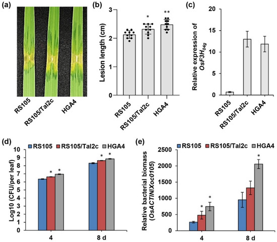 Tal2c from the Xoc strain HGA4 enhances the pathogenicity of Xoc strain RS105 by increasing the expression of OsF3H04g. (a) Image of lesion expansion and (b) lesion length in ZH11 rice leaves after inoculation with RS105, RS105/Tal2c and HGA4 at 14 days. Data represent the means ± SD, n = 10. Asterisks represent significant differences between RS105 and RS105/Tal2c, RS105 and HGA4 (* p ≤ 0.05, ** p ≤ 0.01, Student’s t-test). (c) Relative expression of OsF3H04g at 4 days post inoculation (dpi) with RS105, RS105/Tal2c and HGA4. The internal control was used, OsACTIN. Data represent the means ± SD, n = 3. (d) Bacterial populations and (e) relative bacterial biomass of RS105, RS105/Tal2c and HGA4 in ZH11 rice at 4 and 8 days after inoculation. Data represent the means ± SD, n = 3. Total genomic DNA of ZH11 rice inoculated with Xoc strains at 0 dpi was used as a control. Asterisks represent significant differences between RS105 and RS105/Tal2c, RS105 and HGA4 (* p ≤ 0.05, Student’s t-test).