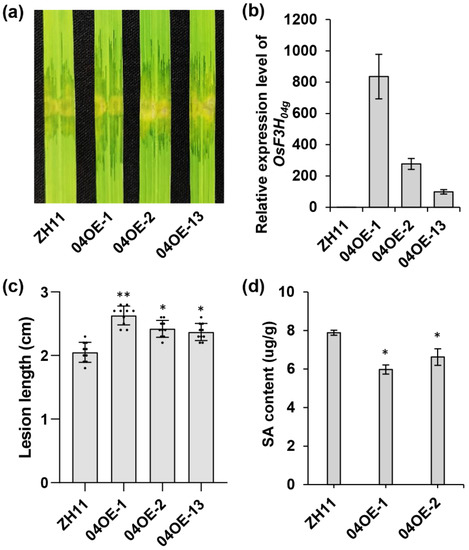 Tal2c enhances the pathogenicity of RS105 and activates the expression of OsF3H04g in rice (Figure 1a,c). To investigate the function of OsF3H04g, we generated 15 OsF3H04g overexpression (OE) lines driven under the ubiquitin promoter in ZH11. Three lines named 04OE-1, 04OE-2 and 04OE-13 were selected for the detection of OsF3H04g expression in the T2 generation (Figure 2a). Compared with wild-type ZH11, the expression of OsF3H04g was specifically increased 834-, 276- and 98-fold in the 04OE-1, 04OE-2 and 04OE-13 lines (Figure 2b). Additionally, disease resistance assays were performed on three OE lines, and they caused more severe symptoms in all OsF3H04g OE lines than in ZH11 after inoculation with RS105 (Figure 2a). The lesion lengths of 04OE-1 (2.63 ± 0.15 cm), 04OE-2 (2.42 ± 0.13 cm) and 04OE-13 (2.37 ± 0.13 cm) were longer than that of ZH11 (2.05 ± 0.16 cm) (Figure 2c). Taken together, we concluded that overexpression of OsF3H04g results in increased susceptibility to RS105. OsF3H03g negatively regulates the resistance to RS105 by inactivating SA in rice [4]. To test the effect of OsF3H04g on SA, we then performed SA quantification on two OsF3H04g OE lines. The results showed that the SA content also decreased in the OsF3H04g OE lines (Figure 2d).