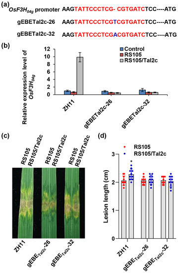 Tal2c was predicted to bind EBE in the promoter of OsF3H04g to activate gene expression and promote infection. Thus, we designed guide RNA and performed gene editing of the EBE in the OsF3H04g promoter. Two individual lines were identified to homozygously insert a “T” and “A” base in lines gEBETal2c-26 and gEBETal2c-32, respectively (Figure 3a and Figure S3). We first measured the induction of OsF3H04g by inoculation with RS105 and RS105/Tal2c on the gEBETal2c-26 and gEBETal2c-32 lines. We observed that the induced expression of OsF3H04g by RS105/Tal2c was abolished in the two lines, gEBETal2c-26 and gEBETal2c-32, compared to the wild-type ZH11 (Figure 3b). In accordance with the deficient induction of OsF3H04g, the disease symptoms caused by RS105/Tal2c in gEBETal2c-26 and gEBETal2c-32 were milder than those in ZH11, while the disease symptoms caused by RS105 were similar to those in ZH11 and the two EBE gene-edited lines (Figure 3c). As shown in Figure 3d, similar lesion lengths caused by RS105 were observed in ZH11 (2.06 ± 0.16 cm), gEBETal2c-26 (2.06 ± 0.13 cm) and gEBETal2c-32 (2.07 ± 0.12 cm). However, the lesion lengths caused by RS105/Tal2c in gEBETal2c-26 (2.09 ± 0.17 cm) and gEBETal2c-32 (2.03 ± 0.19 cm) were shorter than that in ZH11 (2.28 ± 0.19 cm) and similar to those after inoculation with RS105. The above results indicated that the induction expression of OsF3H04g determined by EBE is required for the virulence of Tal2c.