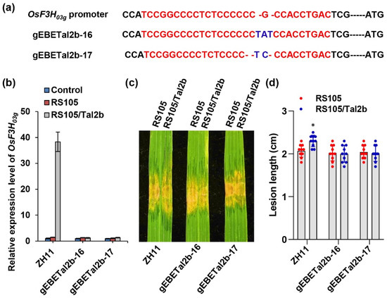 We previously demonstrated that Tal2b could activate the expression of OsF3H03g and thus contribute to the virulence of Xoc HGA4 [4]. However, OsF3H03g was involved in negatively regulating rice immunity, and gene editing of the CDS of the gene resulted in broad resistance to Xoc and Xoo strains, regardless of whether they carried Tal2b [4]. To mine additional evidence to support the hypothesis that Tal2b redundantly functions with Tal2c, we also performed gene editing of EBE in the promoter of the Xoc susceptible gene OsF3H03g in ZH11. The two lines gEBETal2b-16 and gEBETal2b-17 were identified as homozygous substitutions of “TAT” to “G” and “TC” to “CCG” in the EBE region, respectively (Figure S4 and Figure 4a). RS105/Tal2b was abolished to induce the expression of OsF3H03g in both gEBETal2b-16 and gEBETal2b-17 (Figure 4b). After inoculation with RS105 or RS105/Tal2b on ZH11, gEBETal2b-16 and gEBETal2b-17, five out of six inoculations caused similar disease symptoms and lesion lengths, except RS105/Tal2b, which caused milder symptoms and longer lesion lengths on ZH11 compared with the five inoculations (Figure 4c,d). Similar to the above specific interaction between Tal2c and OsF3H04g, these results suggest that OsF3H03g is specifically required for Tal2b-mediated virulence.