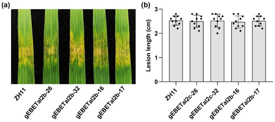 We found that gene editing of EBE in OsF3H04g or OsF3H03g reduced rice susceptibility to Xoc strains RS105/Tal2c or RS105/Tal2b, respectively. However, neither of them had any significant effect on rice susceptibility to Xoc strain RS105, which contains Tal2b and Tal2c [4]. The hypothesis is that Tal2b and Tal2c are redundant pairs of TAL effectors; thus, gene editing of EBE in OsF3H04g or OsF3H03g would not affect resistance to Xoc strains containing Tal2b and Tal2c. We then performed a disease assay for inoculation of HGA4 after gene editing of EBE in OsF3H04g or OsF3H03g plants. The results showed that no significant difference in lesion expansion caused by HGA4 was observed in gEBETal2c-26 and gEBETal2c-32 compared with ZH11 or in gEBETal2b-16 and gEBETal2b-17 (Figure 5a). The lesion lengths in gEBETal2c-26 (2.5 ± 0.24 cm) and gEBETal2c-32 (2.52 ± 0.27 cm), gEBETal2b-16 (2.47 ± 0.25 cm) and gEBETal2b-17 (2.51 ± 0.20 cm) were similar to that in ZH11 (2.53 ± 0.19 cm) (Figure 5b). Thus, the results also supported that Tal2b and Tal2c contained in HGA4 may have redundant functions.