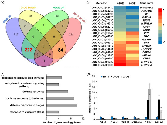 OsF3H04g negatively regulates the rice defense response to Xoc. (a) Venn diagram of the upregulated and downregulated genes in OsF3H04g (04OE-1) and OsF3H03g (03OE-2) OE lines. (b) Gene ontology terms of defense response-related pathways for the common differentially expressed genes (DEGs). The 222 upregulated and 84 downregulated genes in the OsF3H04g and OsF3H03g OE lines were analyzed and enriched. (c) Heatmap of common DEGs related to defense response, SA response and signaling pathway. (d) qRT–PCR analysis of the expression of SA-related genes and defense response genes in OsF3H04g and OsF3H03g OE lines. OsACTIN was used as an internal control. Data represent the means ± SD, n = 3.