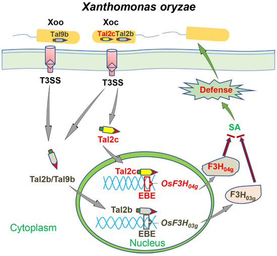 In this work, we revealed that the TALE Tal2c acts as a virulence factor that shows a redundant function with previously reported Tal2b in most Xoc strains, including the highly virulent strain HGA4. The detailed interaction between the two TALEs and targets is illustrated in Figure 7, and these interactions are further described in the following main results. We identified that Tal2c binds to the EBE of the OsF3H04g promoter to promote infection in rice. Overexpression of OsF3H04g resulted in increased susceptibility, decreased SA accumulation and shared common DEGs with the OsF3H03g-OE line. The EBE editing lines of OsF3H03g and OsF3H04g specifically confer resistance to Tal2b- or Tal2c-containing strains. Overall, we significantly broadened the knowledge of TALE-mediated susceptibility to Xoc.