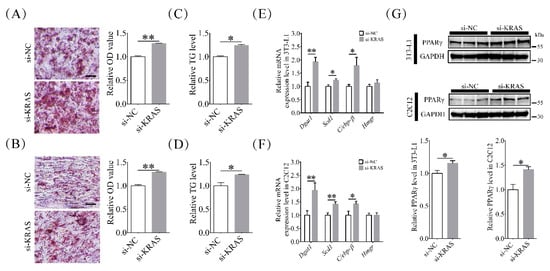 Effects of KRAS on adipogenic differentiation and lipid accumulation in 3T3-L1 and C2C12 cells. (A,B) Representative oil red O (ORO) staining images and relative ORO optical density (OD) value (OD520nm values to total protein level) changes in 3T3-L1 and C2C12 cells after induction of adipogenic differentiation with or without KRAS inhibition. The ORO staining images suggested that the inhibition of KRAS enhanced the lipid accumulation after induction of adipogenic differentiation in 3T3-L1 and C2C12 cells. Scale bar = 50 μm. Significant differences are represented with ** (p < 0.01). (C,D) Relative triglyceride (TG) level changes in 3T3-L1 and C2C12 cells after induction of adipogenic differentiation with or without KRAS inhibition. Significant differences are represented with * (p < 0.05). (E,F) mRNA expression of diacylglycerol O-acyltransferase 1 (Dgat1), stearoyl-coenzyme A desaturase 1 (Scd1), CCAAT/enhancer binding protein beta (C/ebp-β), and 3-hydroxy-3-methylglutaryl-coenzyme A reductase (Hmgr) in 3T3-L1 and C2C12 cells before induction of adipogenic differentiation. Significant differences are represented with * (p < 0.05) and ** (p < 0.01). (G) Relative peroxisome proliferator-activated receptor γ (PPARγ) protein level changes in 3T3-L1 and C2C12 cells after induction of adipogenic differentiation. Significant differences are represented with * (p < 0.05).