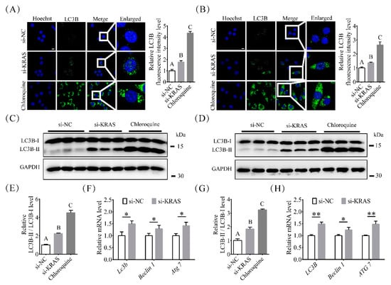 Autophagy, one of the most important processes in cells, also plays important roles in adipogenesis []. Therefore, we detected the levels of microtubule-associated protein 1 light chain-3B (LC3B) in 3T3-L1 and C2C12 cells using immunofluorescence and Western blotting after transfection with siRNA. As shown in Figure 4A, among 3T3-L1 cells, the fluorescence intensity levels of LC3B in the si-KRAS and chloroquine-treated groups were 1.78 ± 0.11-fold and 4.37 ± 0.14-fold of those in the NC group, respectively. The protein levels of LC3B-II/LC3B-I in the si-KRAS and chloroquine-treated groups were 2.25 ± 0.06-fold and 4.51 ± 0.28-fold of those in the NC group (Figure 4C,E), respectively. The mRNA levels of Lc3b, Beclin 1, and, autophagy related 7 (Atg7) in 3T3-L1 cells with KRAS inhibition were 1.49 ± 0.13-fold, 1.30 ± 0.14-fold, and 1.42 ± 0.15-fold of those in the NC group, respectively (Figure 4F).