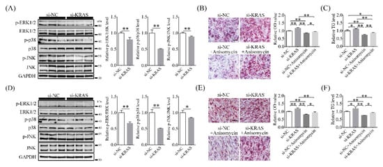MAPK signals also play important roles in adipogenesis and lipid accumulation [,]. Therefore, we investigated the activation of MAPK signals (as indicated by the phosphorylation levels of ERK, JNK, and p38) after KRAS inhibition. The results showed that compared with the NC group, the relative phosphorylated versus total protein levels of ERK, p38, and JNK in the KRAS inhibition group were 0.80 ± 0.07-fold, 0.51 ± 0.01-fold, and 0.89 ± 0.02-fold of those in the NC group for 3T3-L1 cells, respectively (Figure 6A). In C2C12 cells, they were 0.67 ± 0.05-fold, 0.87 ± 0.01-fold, and 0.84 ± 0.02-fold of those in the NC group, respectively (Figure 6C). Then, we assayed the ORO OD values after treatment with anisomycin (ANI, a MAPK activator). The results showed that for 3T3-L1 cells, the ORO OD values in the si-KRAS, si-NC + ANI, and si-KRAS + ANI groups were 1.17 ± 0.05-fold, 0.86 ± 0.02-fold, and 0.94 ± 0.02-fold of those in the NC group, respectively (Figure 6B). For C2C12 cells, the ORO OD values in the si-KRAS, si-NC + 740 Y-P, and si-KRAS + 740 Y-P groups were 1.19 ± 0.02-fold, 0.81 ± 0.02-fold, and 0.93 ± 0.06-fold of those in the NC group, respectively (Figure 6E).